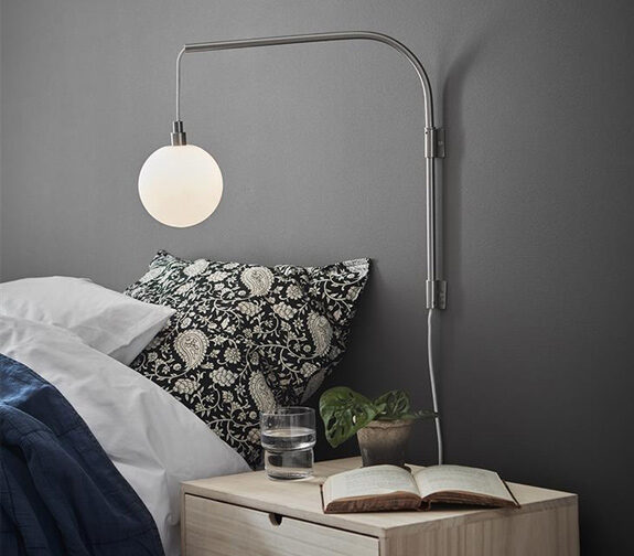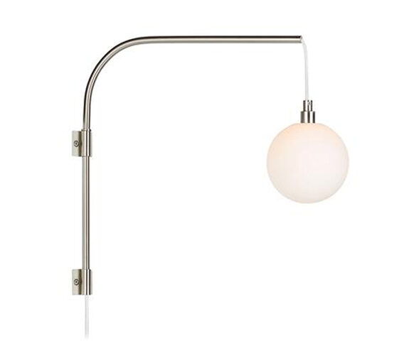 Vägglampa i stål med arm och hängande vit glasskärm. 2m kabel med strömbrytare på sladden. Vridbar i sidled. Max 1x18W. G9-sockel.