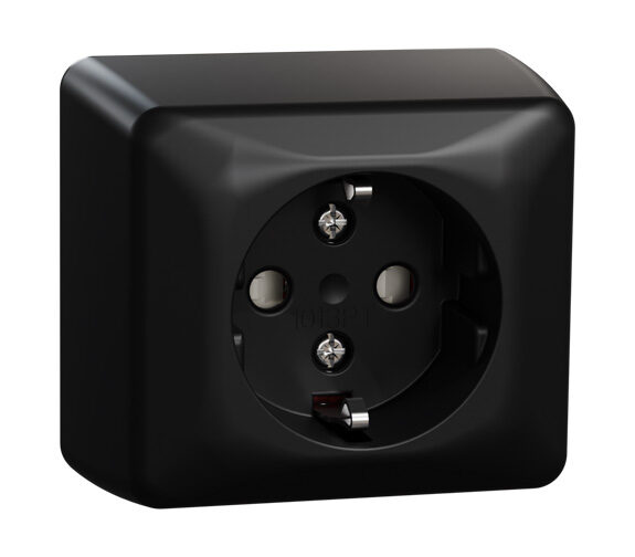 RS sort enkel stikk med jord og barnevern for påveggmontasje. Stikkontakten leveres med bakplate.