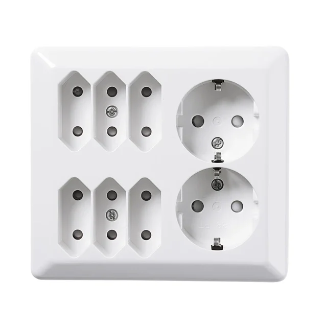 Multistikkontakt med 2 stk uttak med jord og 6 stk eurostikk.