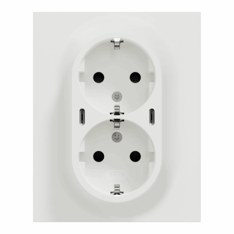 Elko One dobbel jordet stikkontakt med 2xUSB C, designet med Power Delivery teknologi. Sammen med stikkontaktene vil du kunne lade elektroniske apparater opp til 25W i begge C-uttakene. Stikkontakten er innfelt med hel dekkplate og barnevern i fargebestandigmateriale i renhvit (RAL9003). Kan monteres i både enkel- eller 1,5 veggboks.