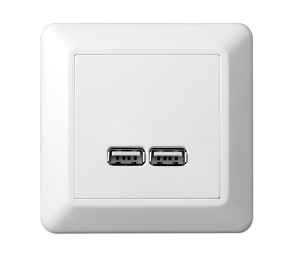 USB lader med to porter for lading av elektroniske apparater, mobiltelefoner, mp3 spillere eller nettbrett. Total ladekapasitet 2,1A – 5V.