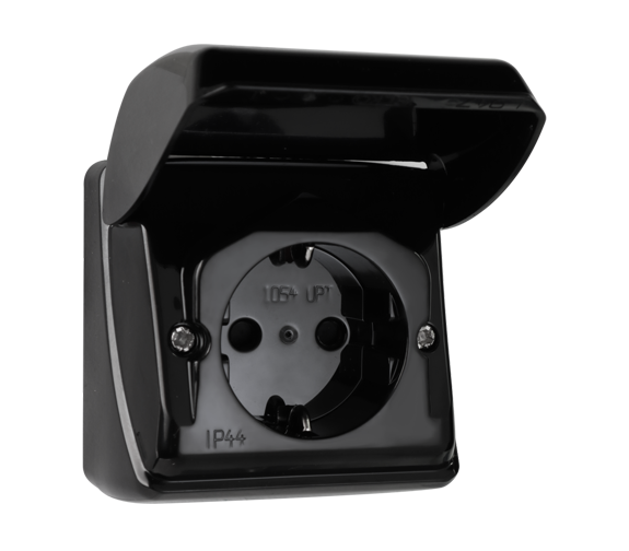 Sprutsikker jordet stikkontakt IP44 med barnevern og klapplokk.