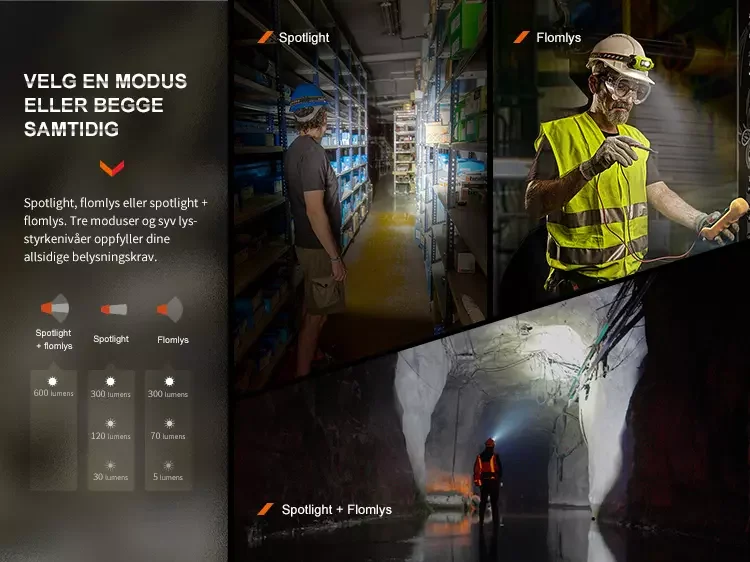 Den allsidige WH23 R har tre lysmoduser: spotlight, flomlys og kombinert lys med både spotlight og flomlys.
