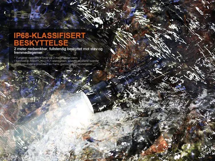 Gir en effekt på opptil 3000 lumen i turbo-modus mens den kaster strålen en avstand på opptil 470 meter.