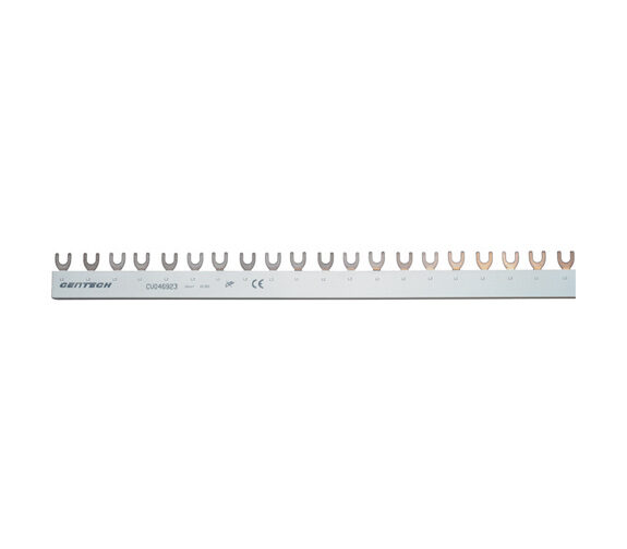 En kappet skinne fra Cenika AS, for 3P L1-L2-L3 gaffel. Skinnen er for fordelingsskap med endekapper for 12 kurser.