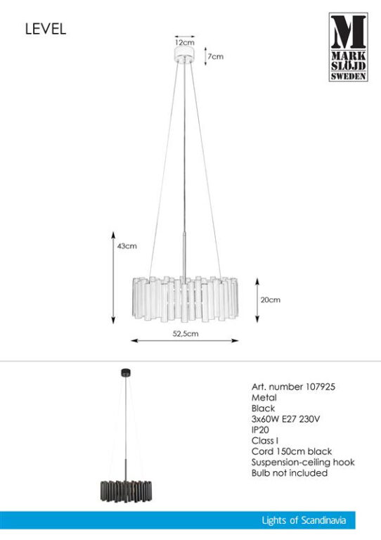 Med 53 cm diameter, 1,5 meter svart tekstilkabel og montering via krok, passer Level 3L perfekt over spisebord, stue eller hall.
