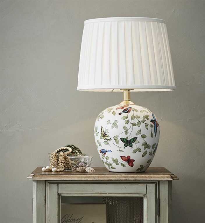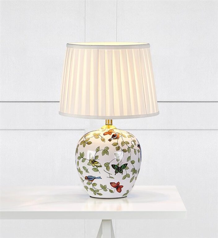 Denne vakre lampen har en keramisk lampefot med delikat mønster av fugler og sommerfugler, kombinert med en hvit tekstilskjerm som gir et mykt og behagelig lys.