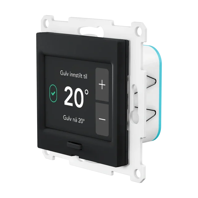 Termostat med romføler og gulvføler for elektrisk gulvvarme opp til 16A. Passer med SG ramme.