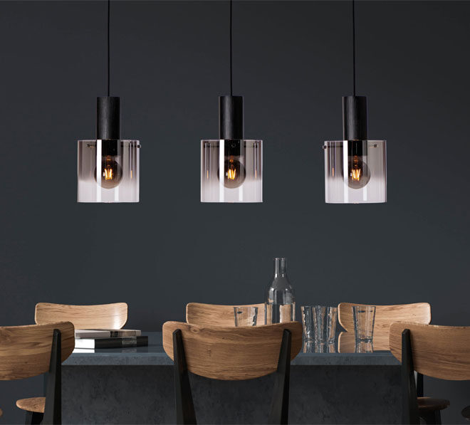 Roxy-lampen med 3 stk takpendler er moderne og i et lekkert minimalistisk design. Kuplene er i røykfarget glass, som gir et lunt og lekker lys. Leveres med skinne for tak, hvor det er mulig å justere høyden på de ulike kuplene.