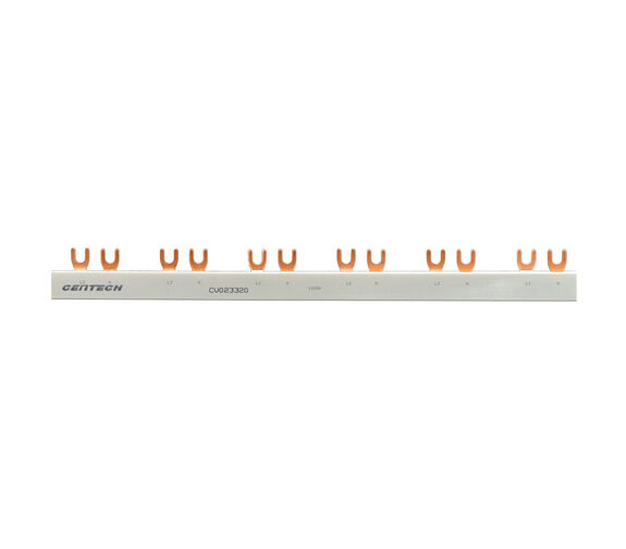 Samleskinne 4polt, 1 meter. Gaffel. For 3moduls 2polt modulært utstyr. L1+N+LEDIG+L2+N+LEDIG+L3+N+LEDIG. 16mm2