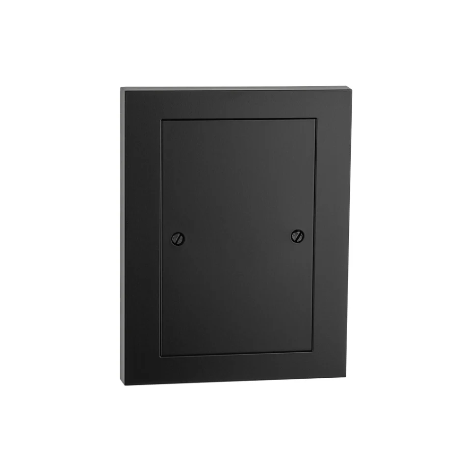 Blindlokk med skruer for montering i veggboks eller påveggskappe. Leveres med festramme av metall og skruer plassert i integrerte skrueholdere på baksiden av blindlokket.