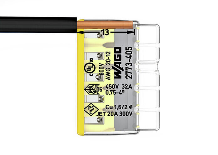 PUSH WIRE® koblingsklemme; for massive og tvinnede ledere; maks. 4 mm²; 3-leder; gjennomsiktig hylse; oransje deksel; Omgivelsestemperatur: maks. 85 °C (T85); 4,00 mm²; gjennomsiktig
