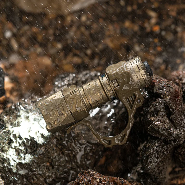 Taktisk lommelykt-ring er utstyrt med et angrepstopp i wolframstål, solid som en stein, egnet for nødsituasjoner for selvredning, forsvar eller taktiske angrep, og kan bryte gjennom med et enkelt slag.
